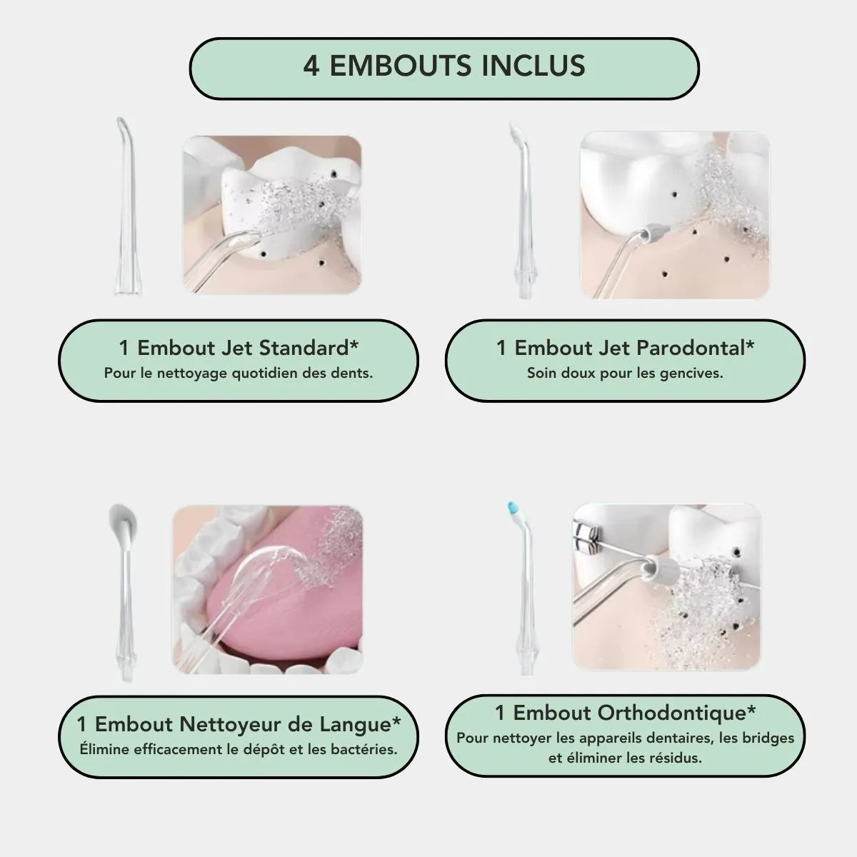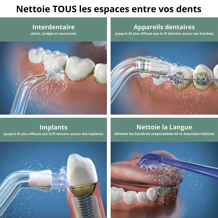 Idéal pour les personnes portant des appareils dentaires, implants ou bridges, cet appareil garantit un nettoyage précis et sans effort. Son réservoir généreux permet plusieurs utilisations sans recharge, et son design ergonomique assure une prise en main confortable.